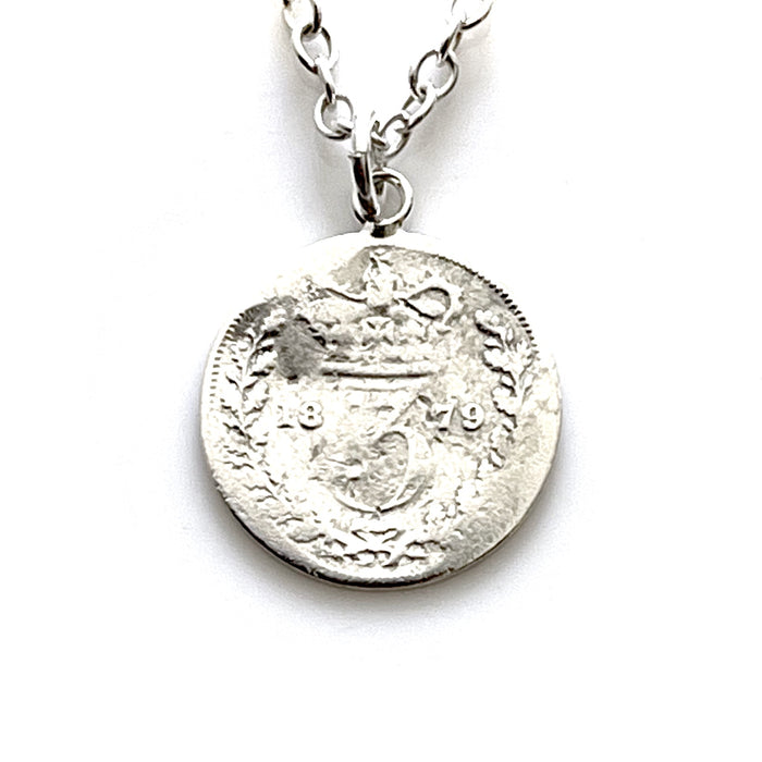 1879 Victorian Three Pence Coin Pendant & Necklace in Sterling Silver