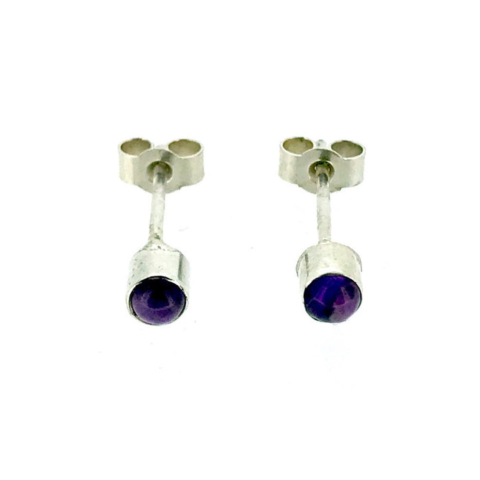 A gorgeous pair of handmade silver studs featuring the gemstone amethyst. These sterling silver earrings are set with a pair of 3mm round cabochon cut natural purple amethyst gemstones. A variety of quartz, amethyst is a stunning naturally occurring deep purple gemstone.