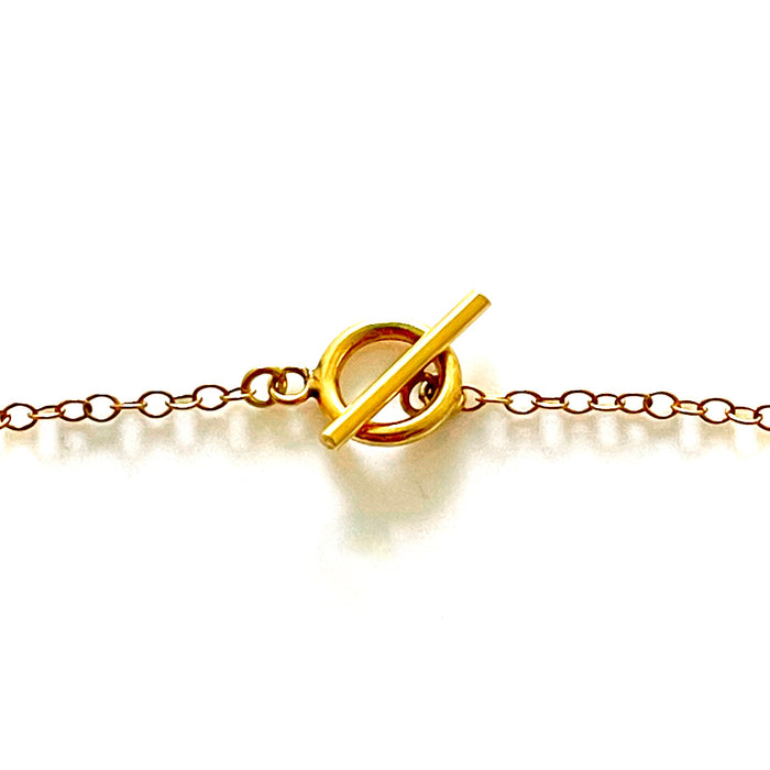 The pendant is gracefully suspended from a delicately crafted 1mm wide cable chain, creating a harmonious balance between the pendant's delicacy and the chain's durability. What sets this pendant necklace apart is its thoughtful design featuring our signature 9mm ring and 14mm bar toggle clasp in 18ct gold plating. This unique addition not only enhances its style but also adds functionality, allowing for easy adjustment of the chain's length.