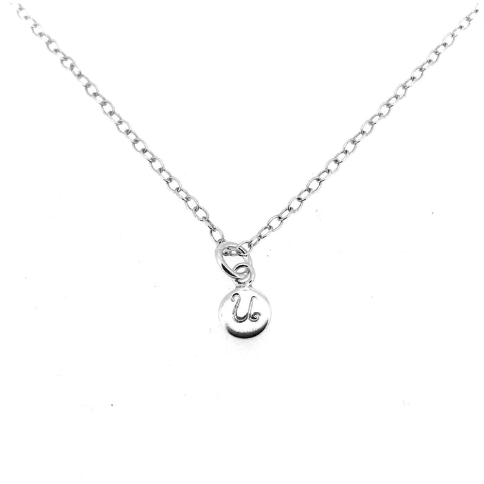 Showcase your individuality with our exquisite Initial U Necklace, meticulously crafted from premium sterling silver and featuring a 6mm disc pendant engraved with an elegant ballroom font. This sophisticated piece of jewellery serves as a thoughtful gift for loved ones or a unique accessory for yourself.