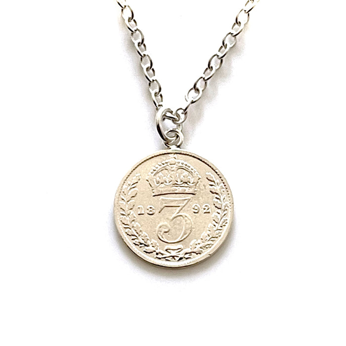 Each pendant features an 1892 Victorian British three pence coin, carefully crafted into a stunning and unique necklace. The pendant hangs gracefully from a matching sterling silver chain, creating a timeless piece of jewellery that celebrates the heritage and sophistication of the Victorian era.