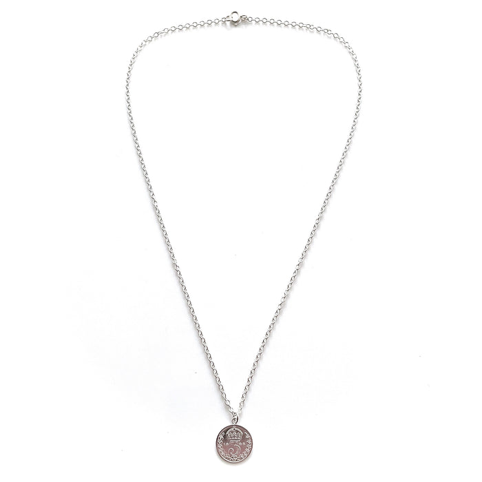 Our 1908 British silver three pence coin necklace features an authentic sterling silver coin, handpicked for its historical significance and impeccably preserved details. The coin measures 16mm in diameter and showcases the King's portrait on the obverse side and the denomination encircled by a wreath on the reverse side. The necklace is fashioned with a robust sterling silver chain, guaranteeing both endurance and comfort.