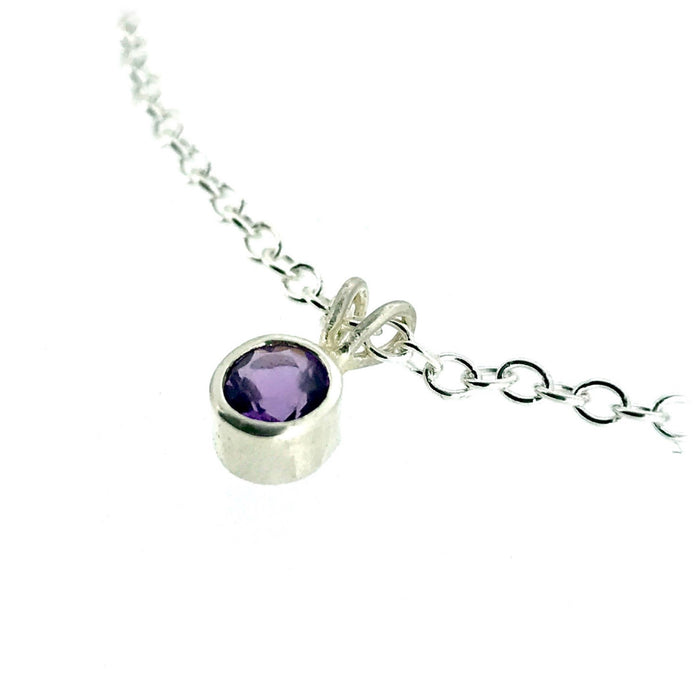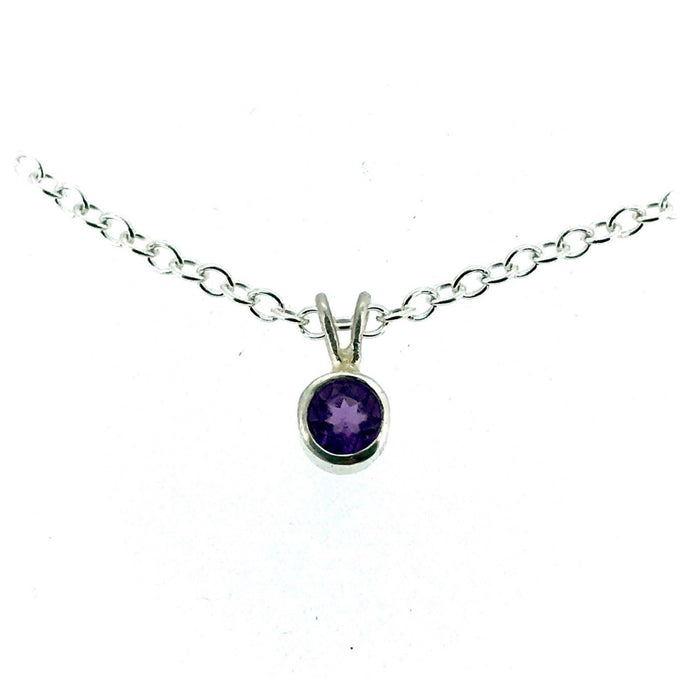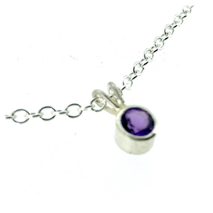 A gorgeous handmade silver pendant featuring the gemstone amethyst. This sterling silver pendant is set with a 5mm round cut natural purple amethyst gemstones. The pendant comes on an beautiful oval link necklace your perfect choice in length. A variety of quartz, amethyst is a stunning naturally occurring deep purple gemstone.